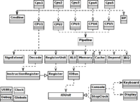 This is a so-called domain-model design. The classes in the software code correspond to real physical components in the hardware MIPS processor. The methods correspond to actual physical operations that the hardware components can do. Virtual operations, such as those that can be composed as combinations of simpler operations, are never implemented in the software no matter how "convenient" it might seem, as they have no physical existence. The class diagram at right shows the dependencies. If you want to add a single-step facility to the Cpu1 simulator, you need to take the single big fetch-decode-execute while loop in the CPU1 code and make it pause for user input before each new cycle. You should make an s ("step") from the user execute another cyle; a c ("continue") should send it back to cycling continuously; a p ("print") and a register number or memory address should show the register or memory contents; a d ("display") should be like print but cause the printout to occur at every step. The main routine in Cpu1This is a quick and dirty precis of the main routine in Cpu1, the wrapper class whose job is to understand the Java command line arguments you used, and then set the CPU1 processor model going: