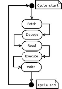Test your modified emulator on the modified machine code. You'll need to make a compensating change to the program in order to save and restore the $ra return address register around the branch, but you'll see the new branch instruction itself working. Notes on the basic MIPS processor model codeThe regularity of the MIPS instruction set architecture results in very transparent simulator code. The simulator code has also been written with the objective of producing code that is clear without being over-sophisticated. As a result, you can check out what any MIPS instruction does by eyeballing the appropriate area of the code. The CPU1 class code is imperative with just the minimum of object-oriented wrapping in order to make it easy to walk through. It's a state machine! And so it is, in reality. Whatever you need to see in order to understand the CPU1 processor model is in that code in the CPU1 class, and you need look nowhere else. You'll see there's just one big while loop in the code. It runs the generic Von Neumann fetch-decode-(read data)-execute-(write data) cycle (see accompanying figure at right), as implemented in all mainstream processor designs since the 1940s, and all the action is embedded inside this one long loop, with one short contiguous part dedicated to each kind of MIPS instruction. So you'll find there are about 10 or 12 shorter contiguous sections making up the body of the loop. For example, the part dealing with jump instructions looks like this ('fetch' has already been done at the start of the loop body, in order to read the next instruction into the IR register). It's mostly block comment: